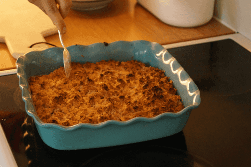 Разогреть духовку до 225 градусов. Смешать овсяные хлопья, миндальную муку, 100 грамм сахара и щепотку соли, добавить масло комнатной температуры и размять руками в крошку. Добавить дробленый фундук и перемешать.