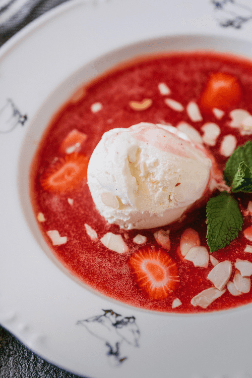 Клубничный суп с ванильным мороженым и лепестками миндаля
