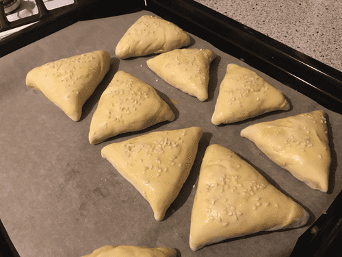 Смазать каждый треугольник взбитым яйцом, посыпать кунжутом.