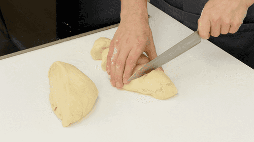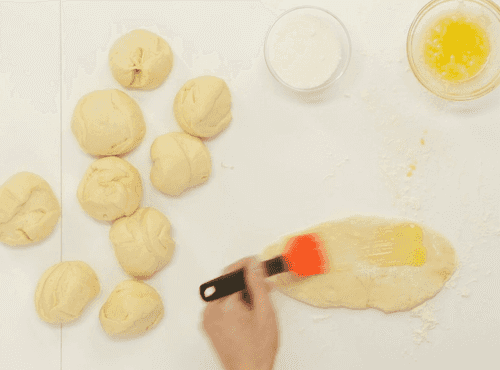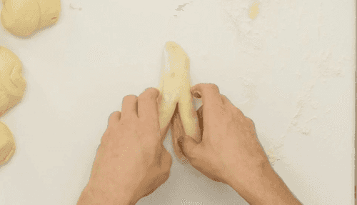 Расстоявшееся тесто обмять на подпыленном мукой столе и разделить на десять равных частей.