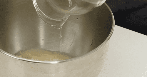 В большой чаше смешать теплую воду, 100 грамм сахара и дрожжи, оставить на 10 минут. Когда на поверхности появятся пузырьки, значит, дрожжи активировались.