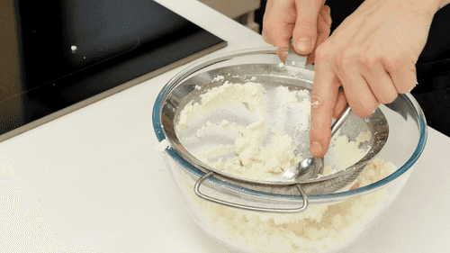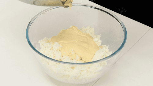 Протереть творог через сито, чтобы он приобрел кремообразную текстуру. Отделить желтки от белков и взбить желтки с сахаром и ванилином до белесого цвета.