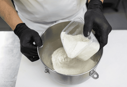 Взять 300 грамм муки высшего сорта, просеять ее и пересыпать в дежу. Добавить чайную ложку порошка какао (без сахара). Какао нужно для того, чтобы у трубочек был серовато-коричневый оттенок, не пшеничный. Добавить 30 грамм сахара, 2 грамма соли. Перемешать все рукой, разбить комочки пальцами. Нужно, чтобы все содержимое равномерно перемешалось и было сыпучим, без комочков.