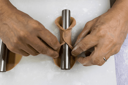 Положить специальную трубочку посередине овала из теста, завернуть один край теста и промазать его желтком, смешанным с водой (воды надо совсем немного, чтобы желток был чуть пожиже, чем обычно). Завернуть второй край, приклеить его к месту, промазанному желтком, обязательно прижать ребром ладони. Раскрыть тесто как раковины или ушки с обеих сторон. Оставить тесто с трубочками полежать минут 10: это нужно, чтобы тесто склеилось и не раскрылось в масле, а прожарилось в форме трубочки.