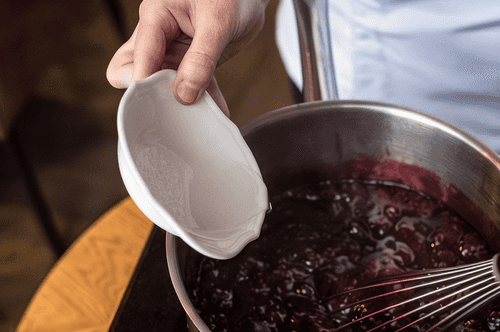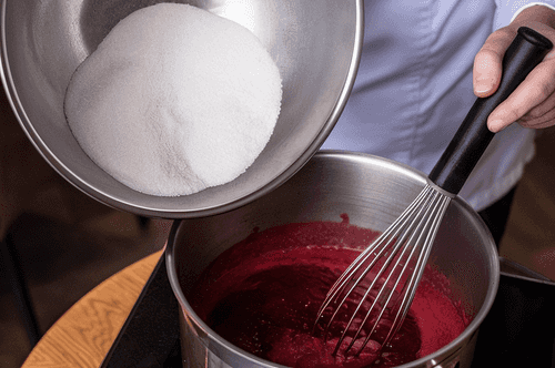 Довести малиновое пюре до кипения на среднем огне, помешивая, чтобы оно не пригорало. Всыпать в пюре смесь пектина с сахаром, сразу же перемешивая все венчиком. Варить все на среднем огне, постоянно помешивая венчиком, пока сахар и пектин полностью не растворятся, в то же время уваривая пюре. На этот процесс уйдет примерно 5 минут.