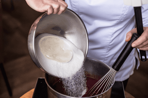 Затем всыпать сахар с глюкозой и, помешивая, продолжить уваривать массу, пока сахар не растворится. На этот раз на уваривание уйдет примерно 10 минут. За это время масса станет гуще и плотнее.