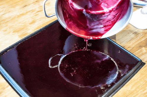 Горячий мармелад надо очень быстро разливать по формам, потому что лимонная кислота активизирует пектин, он начинает схватывать жидкость. Уже через 2 минуты масса загустеет и застынет, и разлить ее станет очень сложно. Налить массу в большой поддон. Дать мармеладу остыть в течение 30 минут, затем накрыть пищевой пленкой, чтобы она с ним контактировала, и убрать в холодильник на 6–8 часов.
