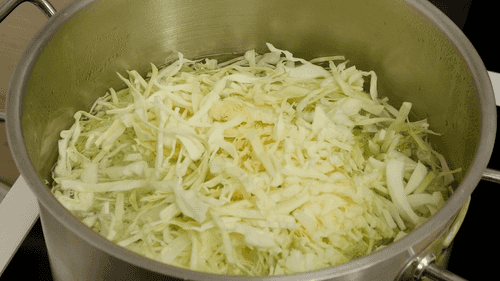 Нашинковать капусту и варить ее в подсоленной воде в течение 20 минут. Затем откинуть на сито. Параллельно положить яйца в кипящую воду и варить их 11 минут. Затем очистить и нарезать небольшими кубиками.