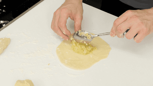 Каждый кусочек раскатать, положить на него начинку и залепить края, придавая пирожку форму лодочки. Так поступить со всем тестом.