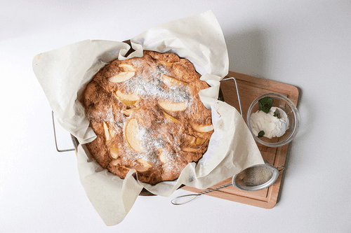 Яблочный пирог на растительном спреде — это ароматное и нежное угощение, пришедшее из русской кухни. Исторически яблоки были одним из самых доступных фруктов, и хозяйки использовали их в выпечке, создавая простые, но удивительно вкусные десерты. В этом рецепте яблоки запекаются в воздушном тесте, пропитывая его своим соком и сладким ароматом. Растительный спред придаёт пирогу особую мягкость и легкость. Вкус сочетает в себе сладость тростникового сахара, кислинку яблок и нежность теста. Подача с сахарной пудрой, мятой и мороженым делает его идеальным для уютного семейного чаепития или праздничного стола.