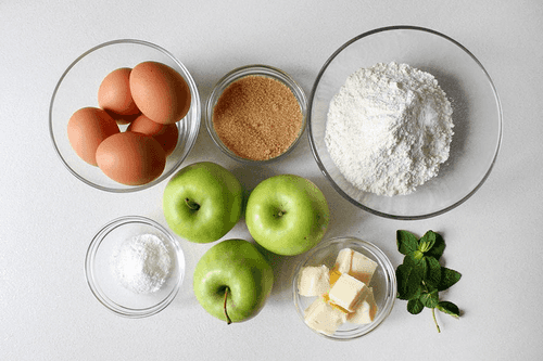 Залить яблоки тестом. Выпекать в духовке в течение 40 минут при температуре 180–200 градусов. Подавать с сахарной пудрой, мороженым и мятой.