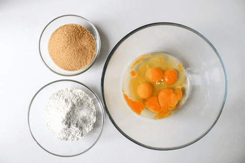 Смешать 1,5 стакана тростникового сахара и 5 куриных яиц, перемешать.