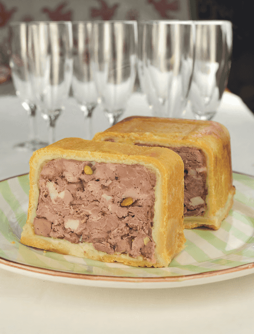 Телячью печень обжарить на оливковом масле. Телячью и свиную вырезки нарезать мелкими кубиками, выложить в миску, залить белым вином, посолить, поперчить и перемешать. Добавить коньяк и фисташки. Нарубить мелкими кубиками свиную шею, сало и жареную свиную печень. Все тщательно перемешать, накрыть пищевой пленкой и оставить на ночь в холодильнике.