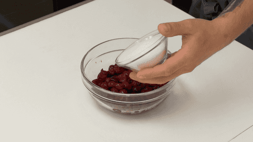 Вишню смешать с сахаром, переложить ее на сито, вишня выделит сок, который будет нужен для соуса к вареникам. Оставить вишню в сите на час.