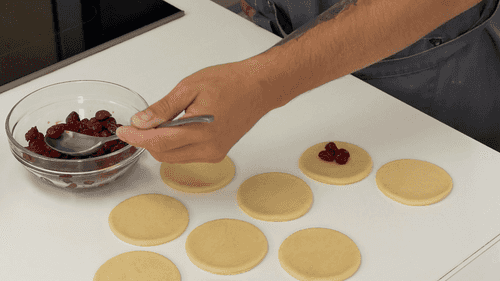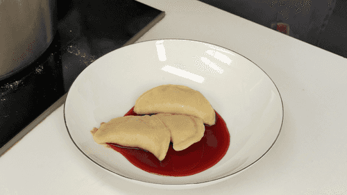 Постоявшее тесто еще раз обмять, тонко раскатать и вырезать кружочки при помощи стакана или специальной вырубки. Тесто очень плотное, и проще будет его раскатать машинкой для пасты. Положить на кусочек теста несколько вишен и слепить вареники.
