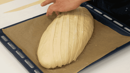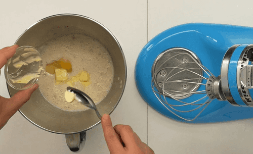 Смешать теплое молоко с сахаром и дрожжами, оставить на 10 минут. Затем добавить одно яйцо, размягченное сливочное масло и 3 грамма соли, перемешать и постепенно добавить муку.
