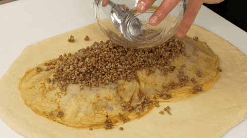 Выложить на них мясную начинку. Накрыть ее двумя блинами, смазать их маслом и уложить сверху грибную начинку. Снова накрыть начинку блинами, смазать их маслом, уложить гречку, накрыв ее блинами и смазав их маслом. Залепить кулебяку, соединяя свободные края теста.