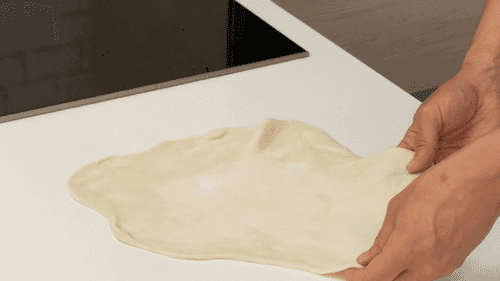 Взять один раскатанный кусок теста, рабочую поверхность смазать растительным маслом и начать вытягивать тесто во все стороны. Можно воспользоваться силой гравитации и вытягивать тесто на весу. В итоге тесто должно получиться очень тонким и прозрачным.