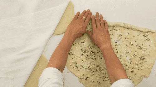 Смазать растянутое тесто смесью сливочного и растительного масла, выложить немного начинки на всю поверхность теста и скрутить его в рулет.