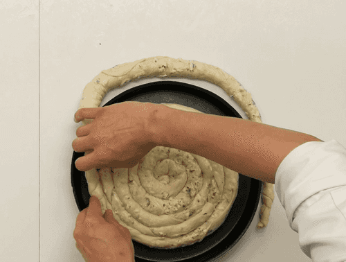 Тот рулет уложить спиралью в центр формы для выпечки. Так же поступить с остальным тестом и начинкой. Каждый следующий рулет должен продолжать спираль, чтобы в итоге получился большой пирог-улитка.