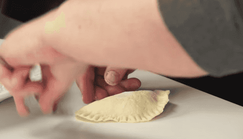 Слепить пирожки. Фарш положить на одну половину заготовки. Сложить пополам и защипать как вареники.