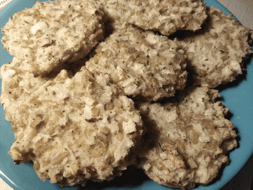 Из овсяной крупы сварить густую кашу. Смешать кокосовый жмых и три ложки овсяной каши.