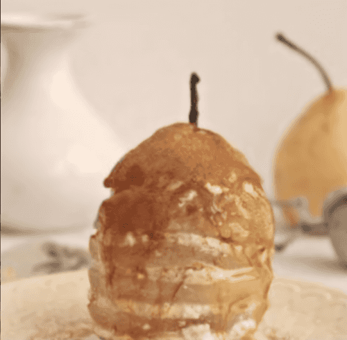 С груши снять кожицу после запекания. Порезать грушу кружками, затем прослоить творожной начинкой, постепенно собирая грушу в первоначальный вид.