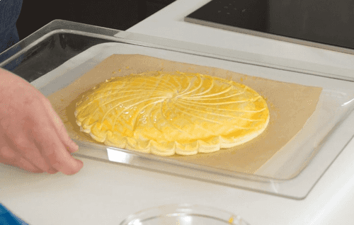 Из слоеного теста вырезать два диска, выложить на один из них крем франжипан ровным слоем, отступая от краев теста на 1–2 см. На этом этапе можно вложить в пирог сюрприз в виде сухой фасолинки или небольшой фарфоровой фигурки. Смочить края теста водой, накрыть вторым диском слоеного теста и аккуратно прижать края, стараясь не сильно деформировать его.