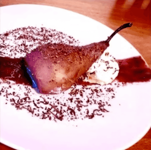 Пряная груша «Белль-Элен» с творожно-лимонным мороженым и винно-малиновым соусом