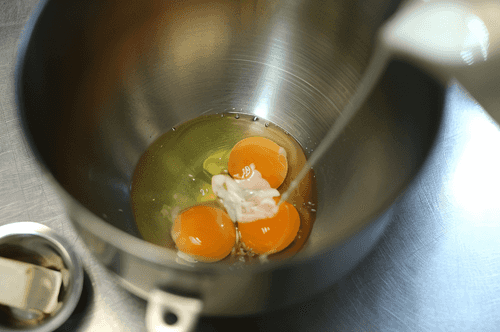 Продолжать вымешивать тесто на третьей скорости. В гладкое тесто начать добавлять масло. Оно должно держать форму, но быть мягким и не горячим (температура — 19–20 градусов). Нарезать его на кубики и добавлять по одному в течение минуты. Это длительный процесс — он нужен для того, чтобы приучить тесто к маслу — чтобы структура теста менялась постепенно. Минут через 5 можно начать добавлять по несколько кубиков. Всего нужно добавить 100 грамм масла.