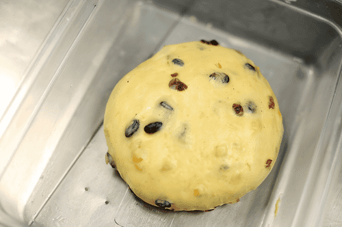 Достать тесто, аккуратно размять его руками в прямоугольник. Посередине сделать углубление для марципана. Положить в него марципан, скатанный в колбаску. Накрыть марципан тестом с одной стороны и с другой, чтобы получилось подобие пеленки. Спрятать края марципана под тестом, чтобы они не горели. Если с теста сыпятся сухофрукты, тоже снять их и засунуть их внутрь. Оставить тесто под крышкой в контейнере на час-полтора. Затем отправить в духовку, разогретую до 170–180 градусов, на 30 минут.