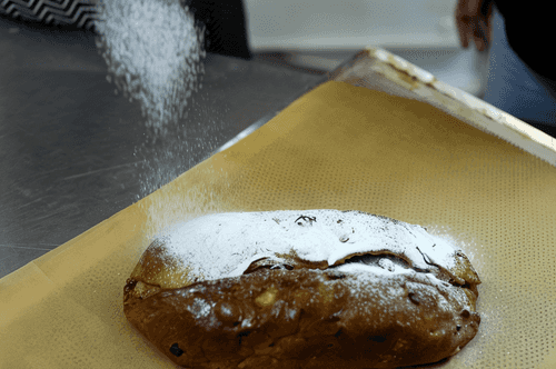 Достать штоллен, смазать по горячему холодным сливочным маслом. Дать маслу впитаться, а штоллену — охладиться. Посыпать сахарной пудрой. По желанию украсить ягодами, орехами, марципанами, цукатами.