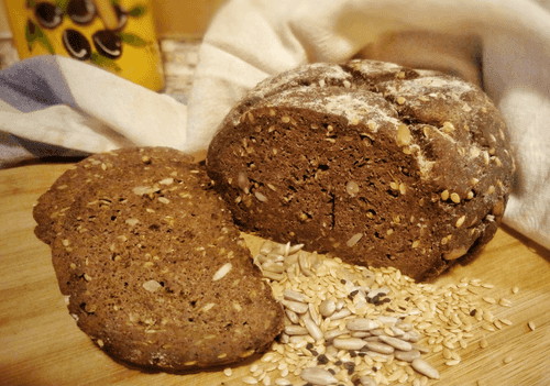 Через 10 минут выключить духовку и оставить там хлеб остывать еще на 30 минут. Затем достать, еще немного остудить в форме, затем вытащить, положить на доску, накрыть полотенцем и остудить окончательно.
