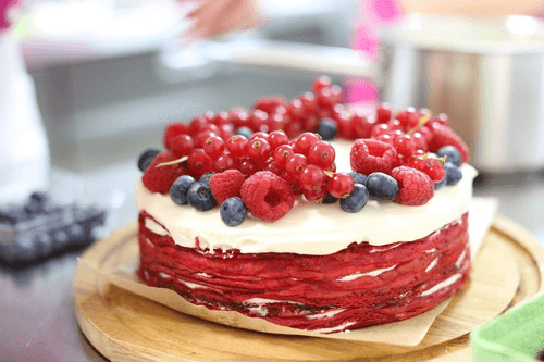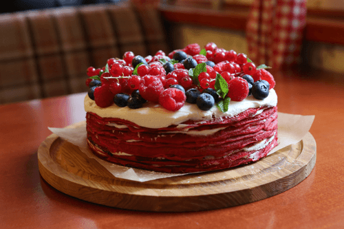Рецепт от шеф-повара Алены Солодовиченко. Она вдохновилась сочетанием американского десерта «Красный бархат» и русских блинов. В итоге получился необычный торт, в который входят яркие алые блины и легкий белоснежный сливочный крем. Для создания гармоничного вкусового букета рекомендуется подбирать ягоды, соответствующие цветовой палитре основного блюда.