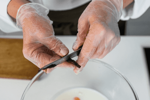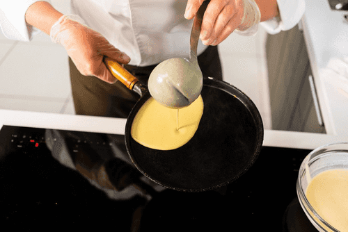 Добавить зерна половины стручка ванили. Взбить тесто венчиком. Если оно слишком густое, добавить кипяченой воды. Тесто должно быть довольно жидким, практически как вода, — тогда блины получатся очень тонкими.