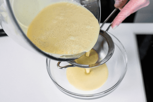 Пропустить тесто через сито, чтобы отфильтровать комочки. Накрыть пленкой и поставить в холодильник на час.