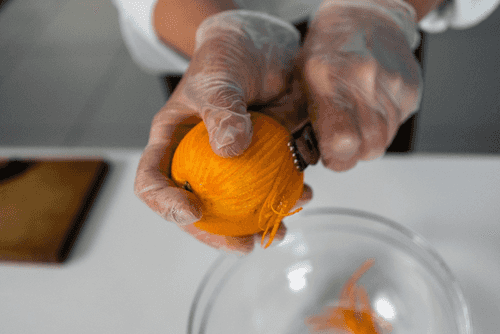 Пока тесто стоит в холодильнике, натереть цедру одного апельсина. Сам апельсин очистить от остатков кожуры, разделить на сегменты, снять пленки. Он нужен для украшения готового блюда.