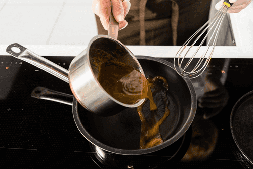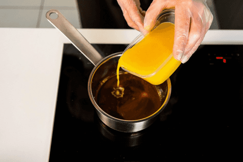 Для апельсинового соуса растопить на медленном огне тростниковый сахар — непрерывно помешивая, чтобы он не пригорел. Когда весь сахар превратится в карамель, залить ее свежевыжатым апельсиновым соком. Вливать аккуратно: вначале смесь начнет шипеть и пузыриться.