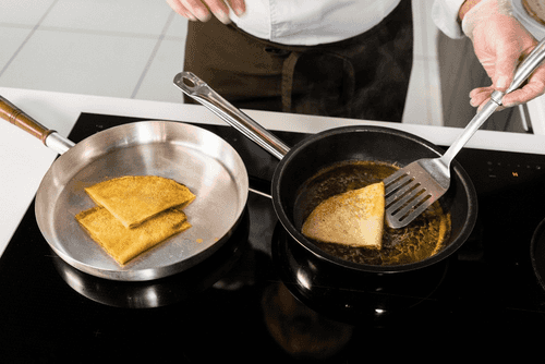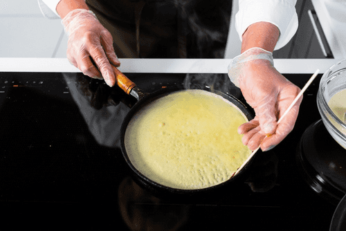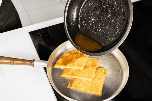 Сложить блин уголком, обжарить в соусе с каждой стороны в течение 30 секунд на среднем огне. Переложить готовые блины в посуду для подачи. Лучше, если это будет сковорода, потому что крепы надо будет фламбировать. Подливать соус в сковороду по мере его выпаривания.