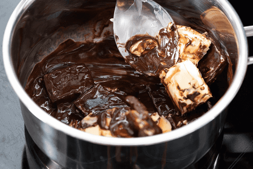 Шоколад и 60 грамм масла растопить в сотейнике на небольшом огне. Затем дать немного остыть.