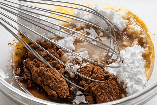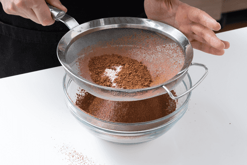 Просеять муку, 50 грамм какао и соду через сито, добавить их в чашу миксера, туда же добавить щепотку соли и смешать все до однородного теста.