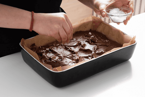 Равномерно покрыть глазурью брауни и посыпать крупной солью. Дать полностью остыть, затем разрезать на порционные квадратики.