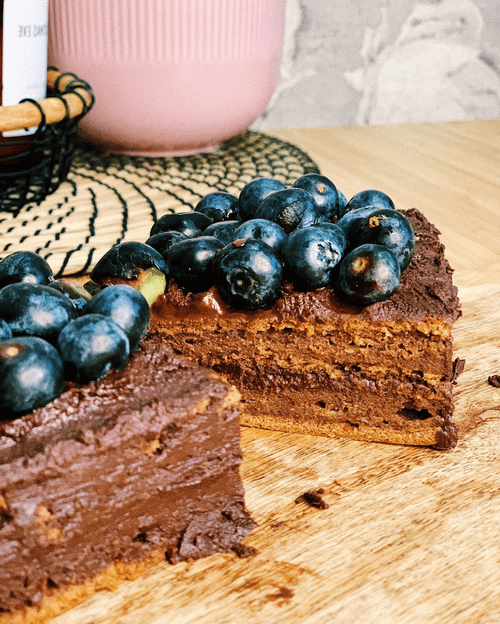 Достать брауни, поделить вдоль, пополам (и сложить друг на друга как тортик) и между/сверху промазать шоколадным кремом. Результат украсить голубикой.