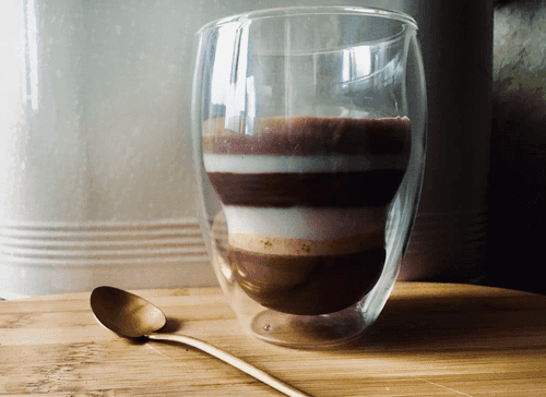 В смесь из какао добавить желатин и и дать отстояться. Далее налить в бокал. Так как рецепт подразумевает слои, то для красивой подачи необходимо использовать стеклянный бокал.