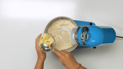 Добавить муку и половину чайной ложки соли, перемешать, затем вмешать в него размягченное масло и яйцо.