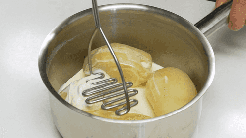 Картофель сварить до готовности, размять в пюре со сметаной и сливками. Посолить и поперчить по вкусу.