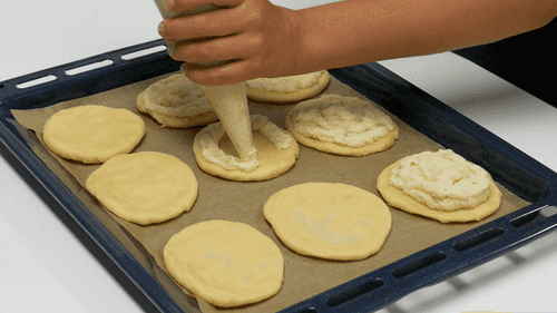 Переложить пюре в кондитерский мешок, шарики теста раскатать в плоские лепешки диаметром 8–9 см.