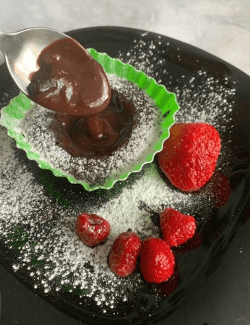 Залить в силиконовые формы, оставляя от края по 1 см, по принципу выпекания маффинов. Духовку предварительно разогреть до 200 градусов и отправить в нее десерт на 5–10 минут. Проверять готовность зубочисткой. Внутри тесто должно быть жидким. Готовый фондан украсить по желанию пудрой или какао.