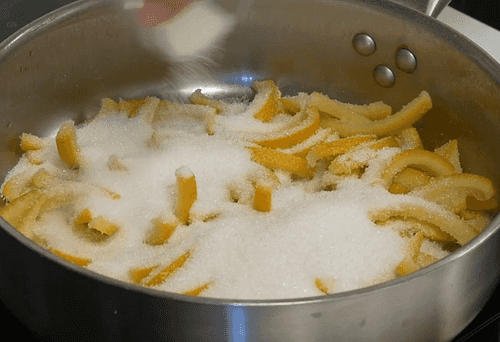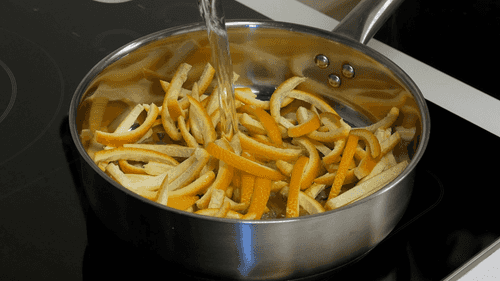 Переложить кожуру в сотейник, залить водой так, чтобы она их покрывала полностью, довести до кипения, затем слить воду. Снова залить водой, довести до кипения и слить. Повторить процедуру еще раз.