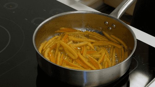 Снять сотейник с огня и оставить корки пропитываться сиропом на 5 минут.